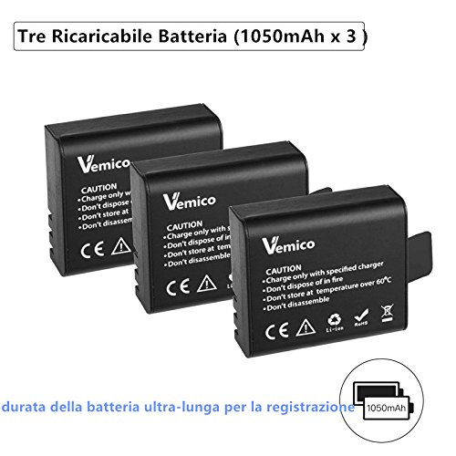 Action Cam Batteria, Vemico 3x1050mAh Ricaricabile Batteria Con Doppio USB Caricabatteria Per Apeman/Campark/DBPOWER…