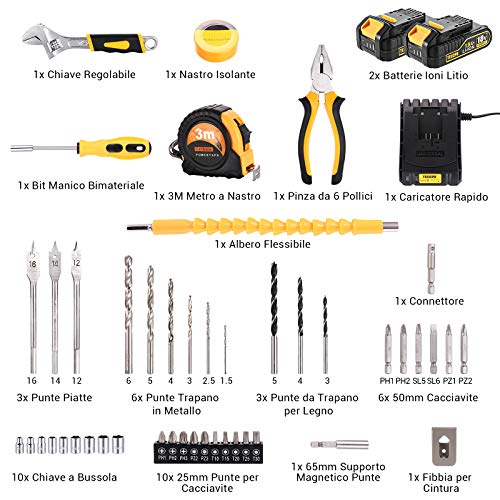 🌟 [45 ACCESSORI & 2* 18V Batteries] Esistono all’interno della custodia 45 accessori & dotato di batteria al litio ricaricabile 18V 1,5Ah e caricabatterie, può essere ricaricata in 1 ora. Accessori abbondanti che soddisfano i requisiti della maggior parte trapani : 3 Punte per legno da 3mm, 4mm, 5mm, 3 Punte per Legno piatte da 12mm, 14mm e 16mm, è ideale per forare il legno. 6 Punte metallo, 16 pezzi di Viti, 10 manicotti e chiave regolabile, pinze, metro a nastro 3m e custodia ecc.
