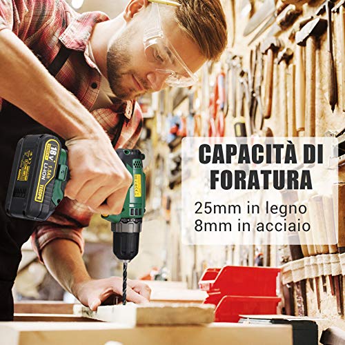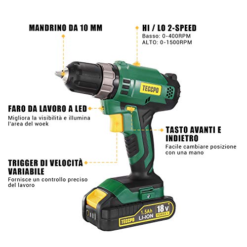 ⚒ TECCPO Avvitatore a Batteria 18V con 45 Accessori – BHD160D ⚒ è un trapano multifunzione affidabile che può essere utilizzato per una varietà di attività fai-da-te in casa e in giardino. Soprattutto per lavori di falegnameria. ⚒Il Avvitatore a Batteria 18V viene fornito con una varietà di utili funzioni⚒: – 21+1 Coppie: L’accuratezza in avvitatura è ulteriormente garantita dai 21 punti di regolazione della coppia di serraggio (fino a 30Nm) Massimo controllo sempre garantito – 2 Velocità variabile 0-400/0-1.500 giri/min: Alta velocità per forare , bassa velocità per avvitature accurate. – Luce da lavoro a LED che consente di perforare in sicurezza in zone difficili da vedere – 2 Batteries al litio da1500mah scorrevole per un rilascio facile e veloce – Il buon bilanciamento e l’impugnatura morbida antiscivolo fanno di questo prodotto lo strumento ideale per garantire ottimi riultati nel massimo comfort. ❥ Cosa è incluso? ❥Trapano a batteria 18V ❥Un caricatore rapido da 2.5A ❥2 pacchi batteria da 1500mAh