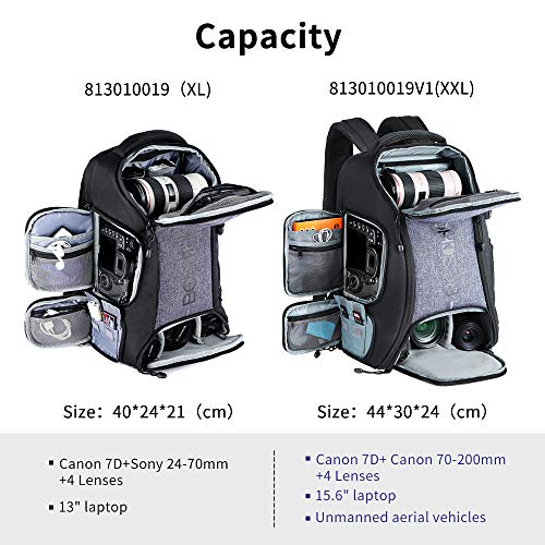 【Tre Scomparti Separati】 Dimensioni esterne: 44 * 30 * 24 cm, ca. 25 litri. Lo scomparto superiore è adatto per un obiettivo da 200 mm o un drone Mavic Air 2. Scomparto medio per 1 fotocamera professionale, 2 obiettivi standard o 2 fotocamere. Scomparto inferiore per 3 obiettivi standard o una fotocamera, 1 obiettivo.