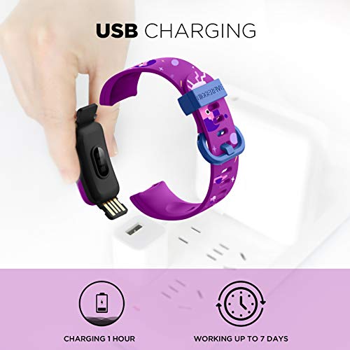 [DESIGN USB INCORPORATO E LUNGA DURATA DELLA BATTERIA] È possibile caricare il fitness tracker con qualsiasi adattatore USB senza la necessità di un caricatore aggiuntivo. I bambini trascorrono meno tempo a caricare e più tempo a muoversi. La batteria del fitness tracker può durare fino a 7 giorni con una carica di 1-2 ore.