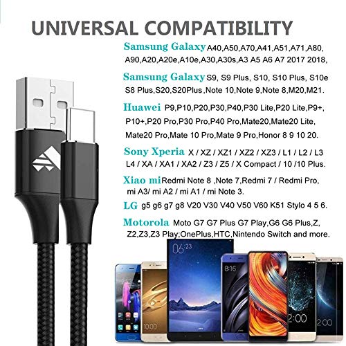 ⚡【Perfettamente compatibile】:Cavo di carica USB tipo c compatibile con Samsung Galaxy S8/S8+/S9/S10/Note 9/8/7/A20e/A10e/A50/A51/A70/A71/A40, HUAWEI P30 Pro/P30/P20 Pro/P20 Lite/P10/Mate 20/Mate10/Nova 2,Honor 10/9 /8/V10/V20,Xiaomi redmi note 8/note 8 pro/5/5X/5S/5S plus/Note2/ Max 2/6,Google Nexus 5X/6P, Sony Xperia XZ/XZ1/X Compact,OnePlus 2/3/3T/6T,LG G5/G6/V20/V30,Moto Z/Z Play/X4/G6/G7,Lumia 950/950XL,ChromeBook Pixel,Google Nexus 5X/6P,HTC e così via.