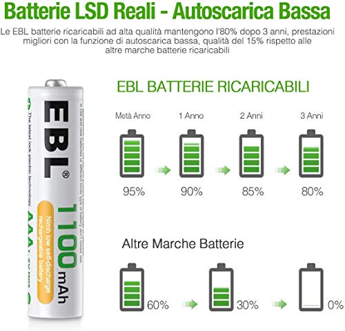 🔋【Basso Auto-Scarico】- Le EBL AAA pile ricaricabili mantenerà 80% della capacità iniziale anche 3 anni di inutilizzo, è altamente raccomandato di ricaricare completamente la batteria ogni 3 mesi.