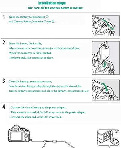 Applicazione: la funzione generale di questo kit adattatore EP-5A è composto da adattatori AC/DC e viene ricaricata continuamente per la fotocamera senza batteria della fotocamera (nota: questo kit può sostituire l’accoppiatore originale NIKON EP-5A-DC e la batteria Nikon EL-14/EL-14a).