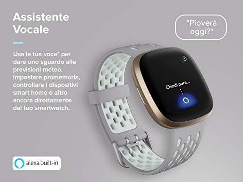 Assistente vocale integrato: Usa l’Assistente Google o Amazon Alexa integrata per ottenere informazioni su notizie e meteo, impostare promemoria per andare a dormire e sveglie, controllare i tuoi dispositivi smart home e molto ancora, tutto parlando direttamente con il tuo smartwatch; la disponibilità e le funzioni dell’Assistente vocale potrebbero variare, vedi fitbit.com/it/voice