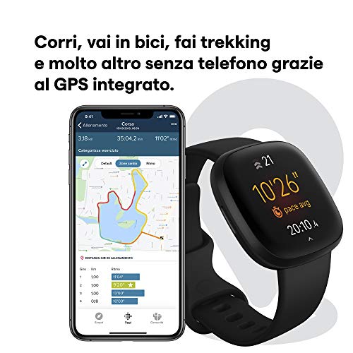 Ti presentiamo Fitbit Versa 3, lo smartwatch con tutto ciò che ti serve per dare il meglio di te. Lascia il telefono a casa e traccia ritmo e distanza durante gli allenamenti all’aperto con il GPS integrato. Ricevi notifiche di chiamate, messaggi e app, utilizza l’Assistente Google o Amazon Alexa integrata e controlla Spotify e Deezer quando il telefono è nelle vicinanze.* E c’è molto di più: grazie a Minuti in Zona Attiva, 20+ modalità di allenamento e un’autonomia di oltre 6 giorni con 12 minuti di ricarica rapida, questo smartwatch ti fornisce tutta la motivazione utile a raggiungere i tuoi obiettivi di benessere e forma fisica.**