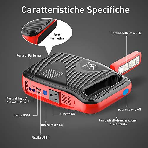 【Doppia Porta di Ricarica Rapida 3.0 USB】 L’avviatore di avviamento è dotato di due uscite USB, tra cui uscita 1 / uscita 2 (QC 3.0): 5 V / 3 A, 9 V / 2 A, 12 V / 1,5 A max, USB 3.0 e 5 V 3 A Tipo C per ricarica (Caricatore da muro incluso). Questo booster pack per auto può essere utilizzato per ricaricare completamente smartphone, tablet, fotocamera, kindle e molto altro alla massima velocità possibile, 4 volte più veloce della power bank generale.