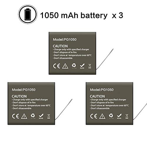 【Originale PG1050】3.7V 1050mAh 3.885Wh action cam batterie,Più batterie, più foto, triplica l’autonomia della fotocamera con un pacchetto di backup completo che include tre batterie sostitutive da 1050 mAh.
