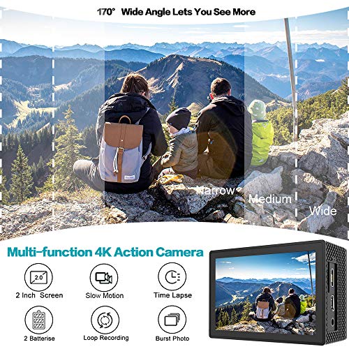 【40M Impermeabile e Action Cam Accessori Gratuiti】Questa action cam subacquea viene fornita con 2 batterie ricaricabili da 1050 mAh con doppio caricabatteria, kit di montaggio e cinturino con base fissa, che ti consentono di montare la tua fotocamera sul casco, biciclette, polso ecc. Dotato di resistente custodia impermeabile IP68 può immergersi fino a 40 metri (131 piedi), ideale per sport acquatici come nuoto, immersioni, surf, drifting.