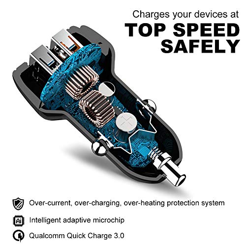 【Carica rapida】 caricabatteria per auto rapido di tipo Quick Charge 5.4A/30W (QC 3.0 3A + Smart IC 2.4A) a doppia porta, uscita porta 2.4: DC 5V/ 2.4A, uscita porta QC3.0: DC 3.6-6.5 V/ 3A, 6.5-9 V/ 2A, 9-12 V / 1.5A, totale 30 W. Sistema di controllo della carica tecnico i-Smart per garantire la sicurezza dei tuoi dispositivi.