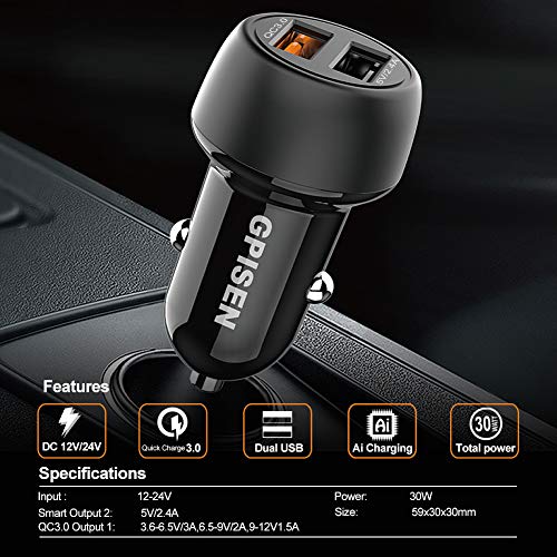GPISEN Charge 3.0 Caricatore per Auto 5.4A/30W (QC 3.0 3A + Smart IC 2.4A) Caricatore Rapido Adattatore Caricatore da…
