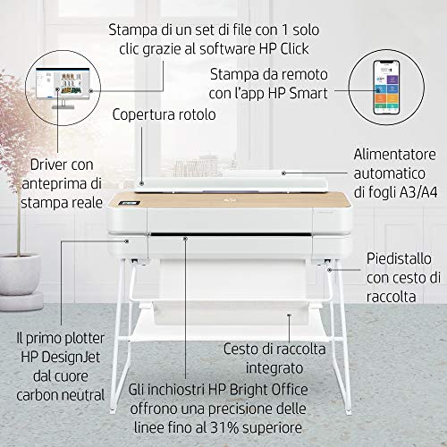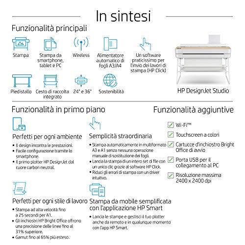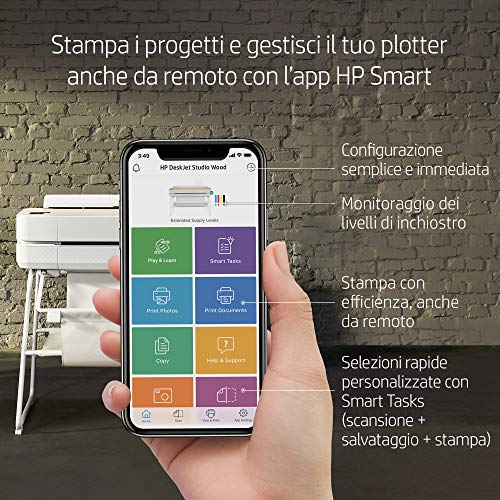 Con le stampanti a getto termico di inchiostro HP DesignJet è possibile stampare in modo veloce ed in alta qualità, direttamente dal tuo studio o ufficio. La continua ricerca ed innovazione di HP cambia il modo di lavorare di ingegneri e architetti: basta un click per stampare le tue idee e condividerle con i tuoi colleghi e clienti. Grazie ai software HP puoi risparmiare tempo ed aumentare la tua produttività stampando non appena il progetto è ultimato. Accedi direttamente al Cloud con HP Click e seleziona i file dal tuo smartphone con l’App HP Smart. I colori vividi e la netta precisione del tratto assicurano qualità ed omogeneità di immagine e testi nitidi, su stampe di piccole e grandi dimensioni, come GIS, MCAD, editing, rendering, banner, grafiche, disegni architettonici ed ingegneristici. Il plotter HP DesignJet Studio Wood da 91 cm si presenta con un design moderno, combinato con un elegante inserto in legno, pensato per inserirsi facilmente nell’arredo di qualsiasi studio ed ufficio. Grazie alle sue dimensioni ridotte di soli 1.317 x 555 x 932 mm è uno dei plotter più piccoli al mondo se comparato alle alternative offerte dalla concorrenza. HP DesignJet Studio è la prima DesignJet in cui HP ha compensato l’impatto residuo della produzione di CO2 legata all’estrazione e alla lavorazione delle materie prime, alla produzione e al trasporto delle stampanti, nonché all’utilizzo di elettricità, carta e cartucce in conformità al Protocollo CarbonNeutral. Alimentazione a fogli con formato da A0 ad A4 e con rotolo in formato da 279 a 914 mm, con grammatura della carta da 60 a 280 g/m² e spessore massimo di 0,3 mm. La stampante è accessoriata con taglierina orizzontale per una maggiore precisione, piedistallo e vassoio di raccolta. Velocità di stampa di un foglio in formato A1 ogni 25 secondi, con una media di 82 stampe A1 all’ora. È predisposto di singola testina di stampa da 1376 ugelli, per una resa cromatica uniforme e omogenea, grazie alla combinazione tra le 4 cartucce ciano, giallo, magenta e nero. Compatibile con cartucce originali HP a getto termico d’inchiostro: 3ED28A, 3ED29A, 3ED58A, 3ED67A, 3ED68A, 3ED69A, 3ED77A, 3ED78A, 3ED79A. È dotato di connessione Wi-Fi, Wi-Fi integrato, Gigabit Ethernet, USB Hi-Speed 2.0. Il prodotto rispetta gli standard ENERGY STAR. Contenuto della confezione: Stampante HP DesignJet serie Studio, piedistallo stampante, alimentatore automatico a fogli, copertura rotolo, testina di stampa, cartucce di inchiostro in dotazione, supporto rotolo, guida di riferimento rapido, guida all’installazione, cavo di alimentazione. Il cavo USB di collegamento al PC non è incluso.
