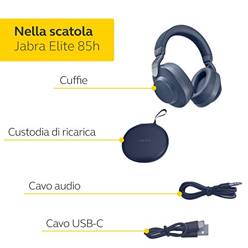 La consegna include: Jabra Elite 85h Cuffie Stereo; custodia protettiva da viaggio; cavo di ricarica USB-C; cavo audio; peso: 296 g; blu marino