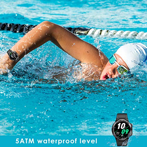 Fitness Tracker impermeabile 5 ATM e schermo rotondo da 1,3 pollici – soddisfa i requisiti standard dell’acqua 5 ATM, con questo smartwatch è possibile evitare problemi durante il nuoto o l’allenamento sotto la pioggia. (Nota: non mettere in acqua superiore a 38 °C come doccia, sauna, ecc. usare). Questo smartwatch è dotato di uno schermo rotondo TFT LCD a colori da 1,3 pollici. Il vetro temperato di alta qualità lo rende resistente ai graffi, durevole e resistente a acqua e polvere.