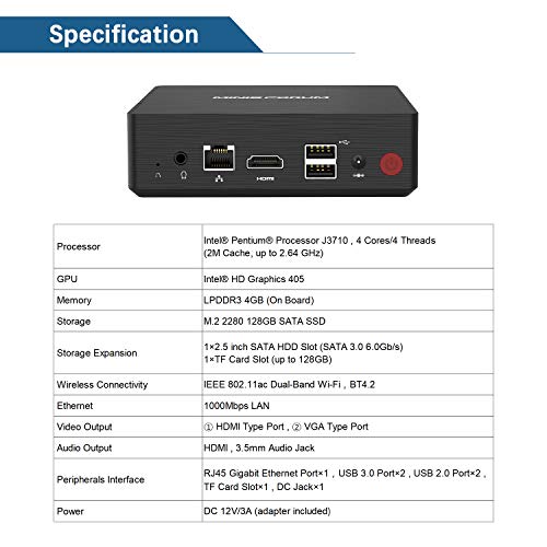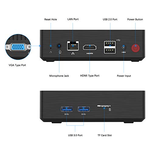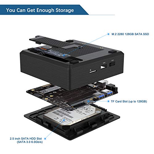 【Piccolo e potente】 Dotato di un veloce SSD da 128 GB (espandibile con SSD SATA M.2 2280 a 1 TB) e 4 GB di RAM, il computer offre spazio di archiviazione sufficiente per l’installazione dei programmi. Inoltre, la memoria può essere espansa con un aggiornamento fai da te. È possibile utilizzare facilmente un disco rigido / SSD SATA3.0 6Gb / S aggiuntivo da 2,5 pollici con una capacità fino a 2 TB e una scheda TF (fino a 128 GB).