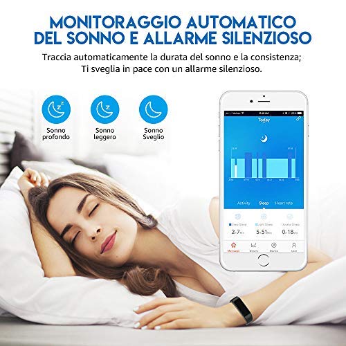 Activity Tracker: Questo orologio fitness tracker utile date le sue molte funzioni come pedometro, per monitoraggio della frequenza cardiaca, contatore calorie, misurazione distanza percorsa, e rilevamento della qualit¨¤ del sonno. Inoltre, grazie all¡¯APP correlata al nostro orologio fitness ¨¨ possibile seguire tutte le attivit¨¤ quotidiane svolte riguardanti le funzioni sopra elencate, in modo da rendere il nostro smart watch un compagno ideale per le giornate di uomini e donne.