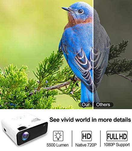 【Nativa 720P Proiettore hd】 Videoproiettore è dotato di una risoluzione nativa di 1280* 720P e di un rapporto di contrasto di 3000:1 e offre una qualità d’immagine Full HD 1080P chiara e colorata. La più recente tecnologia LCD 4.0 aumenta la luminosità del colore del proiettore a 5500 lumen, che è l’80% più brillante rispetto a proiettori comparabili. Mini proiettore portatile con borsa è la scelta migliore per i vostri campi outdoor, viaggi e film notturni con la famiglia o con gli amici.
