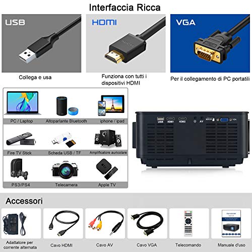 ❤【Ampia compatibilità】Il 1080P HD proiettore portatile video è dotato di porta HDMI * 2, USB * 2, AV, uscita audio. Può essere facilmente compatibile con smartphone, PC, laptop, lettori DVD, blue-ray, U-disk, hard disk, TV box, Fire TV Stick, ROKU Stick, Chromcast, PS4, ecc. Supporta l’uscita per cuffie da 3,5 mm, può essere collegato un auricolare o mini altoparlante. Perfetto per essere usato all’interno.