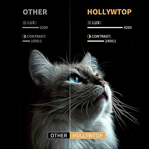 【Connessione WiFi e 1080P Full HD】Il mini proiettore HOLLYWTOP supporta connessioni cablate e WiFi per sistemi iOS e Android, e supporta il rapporto di contrasto Full HD 2400: 1, offrendo una qualità dell’immagine a colori Full HD 1080P chiara e vibrante. Il nuovo metodo di illuminazione uniforme con distorsione trapezoidale di ± 15 gradi garantisce la migliore esperienza visiva e nessuna area scura appare sui bordi dello schermo.Ti offre un’esperienza cinematografica da sogno e bellissima.