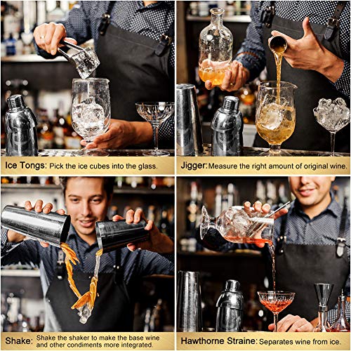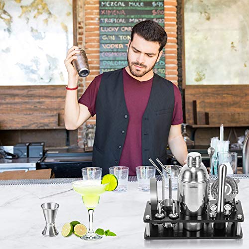 IL PACCHETTO INCLUDE: Shaker da 750 ml + Jigger + Pinze da ghiaccio + Muddler + Straine Hawthorne + Apribottiglie + Versatore per bottiglie x2 + Sughero x 2 + Palla per mescolare + Cannucce per cucchiaio + Cucchiaio da bar + Pennello per paglia + Pennello per pulizia + 2 cannucce in acciaio inossidabile + supporto in legno + manuale per cocktail. Dotato di tutti gli accessori necessari per cocktail bar. adatto a barman entry-level e di livello professionale.