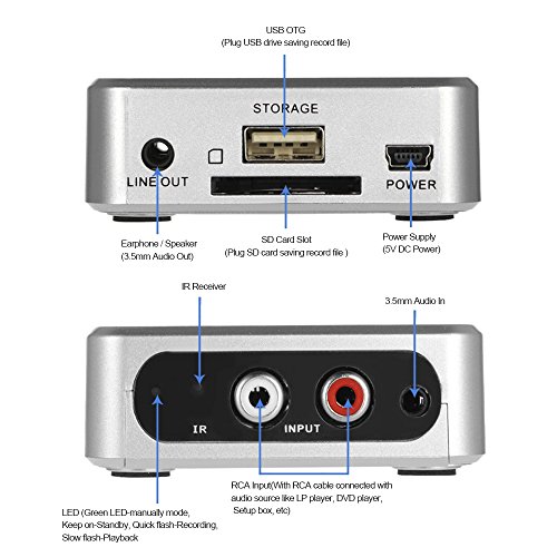 Controllo delle funzioni Recorder e Player con telecomando o dal pulsante Rec sul case, indicatore di stato a led, registrazione in modalità “manuale” o “automatica” in grado di rilevare gli intervalli tra i brani per suddividere le canzoni in singoli file mp3 ideale per salvare e digitalizzare vecchie audiocassette o dischi.