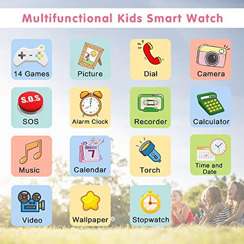 🎁 【Smartwatch Multifunzionale per Bambini】 Questo orologio intelligente per bambini ha più funzioni per soddisfare le tue diverse esigenze. Ad esempio: telefonate a due vie / SOS / fotocamera / video / musica / calcolatrice / sfondo / cronometro / calendario / sveglia / torcia / registratore ecc.
