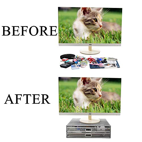 Alza il monitor all’altezza degli occhi per un’esperienza visiva confortevole ed ergonomica. Ti libera da mal di testa da tensione o da affaticamento degli occhi e del collo guardando lo schermo del tuo computer. È anche adatto per mettere DVD, laptop, stampante, fax, ecc. Vantaggio: grande capacità, robusto e spesso, multiuso.