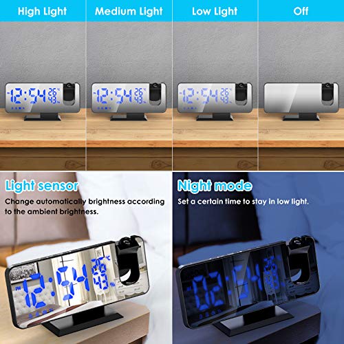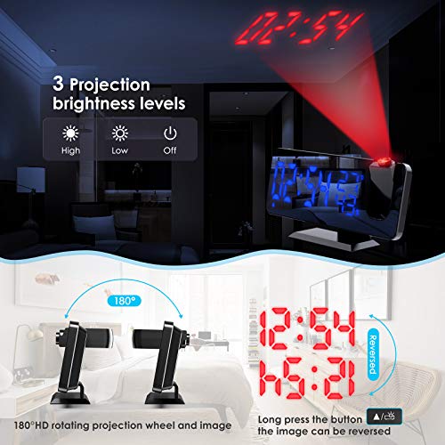 Proiezione rotante a 180° HD e 3 livelli di luminosità – La sveglia a proiezione digitale adotta un design a luce rossa rotante a 180° ad alta definizione, che può essere proiettata a parete o a soffitto. Quando ci si sveglia di notte, si può facilmente capire l’ora. Inoltre, ci sono 3 livelli di luminosità (High/Low/OFF), quindi è possibile modificarli in base alle proprie esigenze.