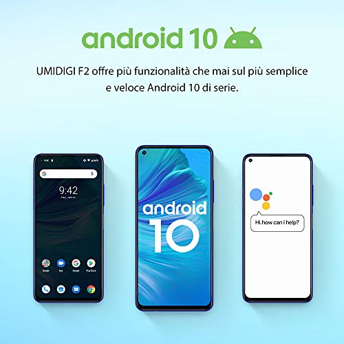 【Android 10 & Processore Helio P70 AI & 6GB 128GB】UMIDIGI F2 offre più funzionalità che mai sul dispositivo Android 10 più veloce e più fluido di sempre. Come “OK Google” sullo schermo bloccato. Smartphone UMIDIGI F2 offrono un’esperienza utente fluida ed una reattività fulminea durante le sessioni di gaming, mentre lo spazio di archiviazione sarà più che sufficiente per le tue app, i tuoi giochi, I film, musica, foto ecc.