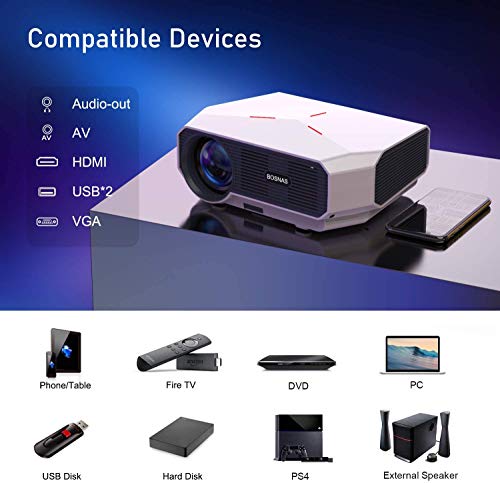 Videoproiettore WiFi, BOSNAS Nativo 720P Mini Proiettore Portatile 5800 Lumens, HD 1080P Supportato, 200″ Home Theater Proiettore LED con 78000 Ore per TV Stick PS4 Laptop HDMI VGA Android iOS
