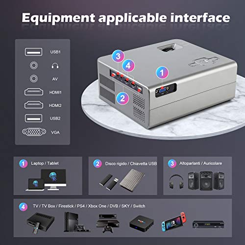Connessione multi-dispositivo: Il proiettore portatile ha più porte, tra cui 2 usb/2 hdmi/av/uscita audio/vga. Queste interfacce possono essere facilmente collegate a pc, laptop, smartphone, tablet, chiavette usb, xbox, ps4, ecc.