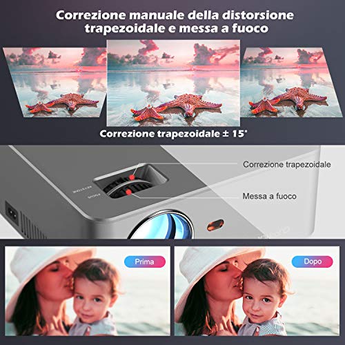 Grande schermo e altoparlanti integrati: Il mini proiettore ha una dimensione dello schermo di proiezione di 30-200 pollici e una distanza di proiezione di 1,4 m-3,7 m, supporta la messa a fuoco manuale e la correzione del trapezio meccanico, l’ampio schermo crea un’atmosfera cinematografica. Inoltre, lo stereo incorporato con gli altoparlanti offrono un’eccellente qualità del suono. è possibile anche collegarlo ad altoparlanti esterni per soddisfare tutta la tua famiglia